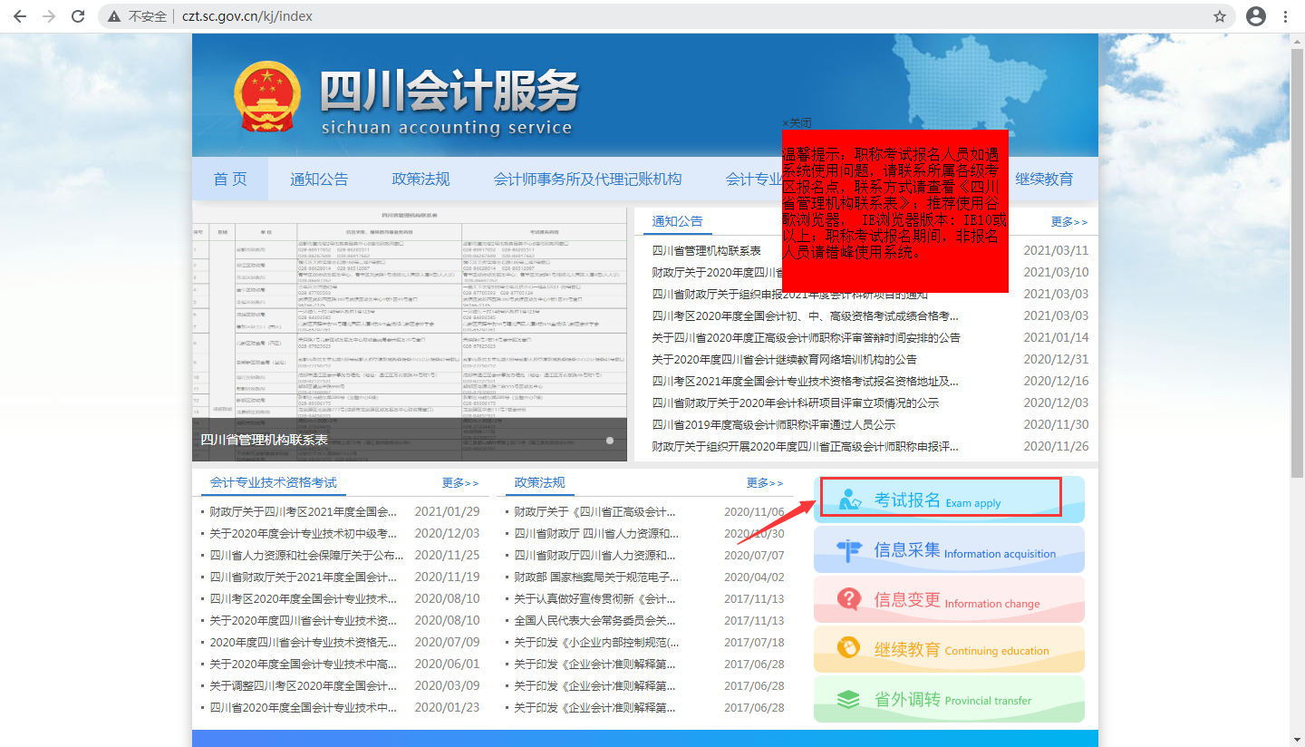 報名時間爲2021年3月15日至31日。實行網上報名。1、報考人員登錄“四川會計服務”網站(http://czt.sc.gov.cn/kj/index)