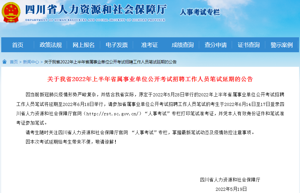 如:廣安人社局在5月16日就發(fā)布了通知,原定于5月28日、29日舉行的2022年廣安市公開(kāi)考試招聘事(shì)業單位工作人員(含中小學(xué)校教師公招)及2022年上半年廣安市市級事(shì)業單位公開(kāi)考調工作人員筆試延期舉行。筆試具體時間另行通知。