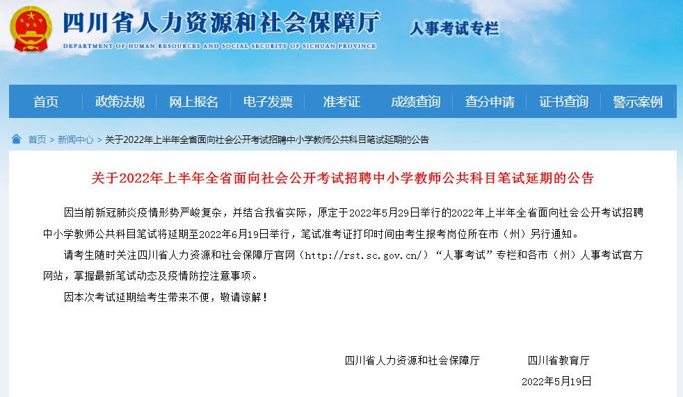 昨日,四川省人社廳官網人事(shì)考試專欄發(fā)布兩(liǎng)則消息,因當前新冠肺炎疫情形勢嚴峻複雜,并結合我省實際,將(jiāng)2022上半年四川省屬事(shì)業單位公招筆試、全省中小學(xué)教師公招筆試延期至6月舉行。官方通知截圖如下↓↓